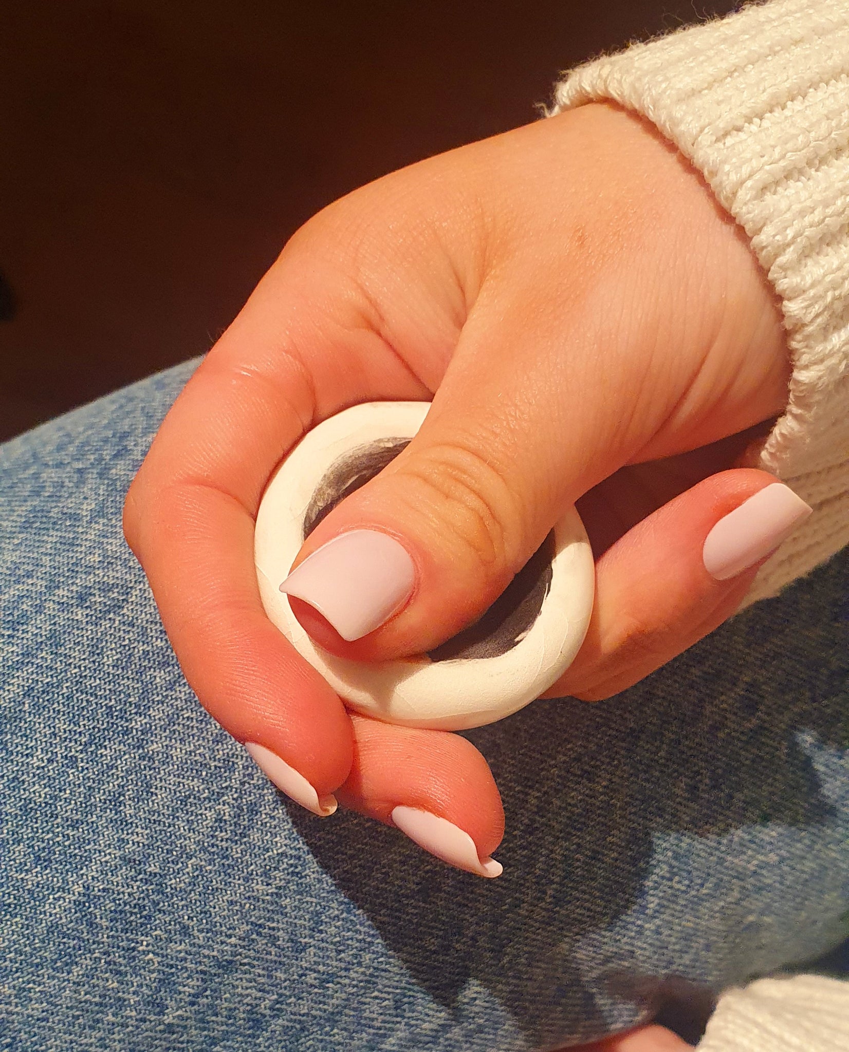 Touch: Let your thumb find its natural place in the curve of the stone. Notice the contrast between the smooth glazed surface and the raw ceramic beneath your fingertips.